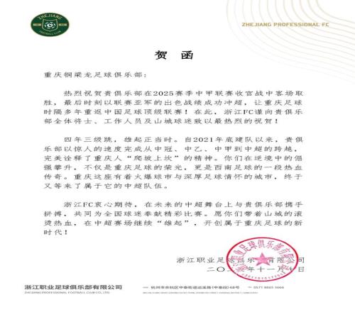 北京时间11月10日,浙江职业足球俱乐部官方发布贺函,祝贺重庆铜梁龙与辽宁铁人成功冲超。